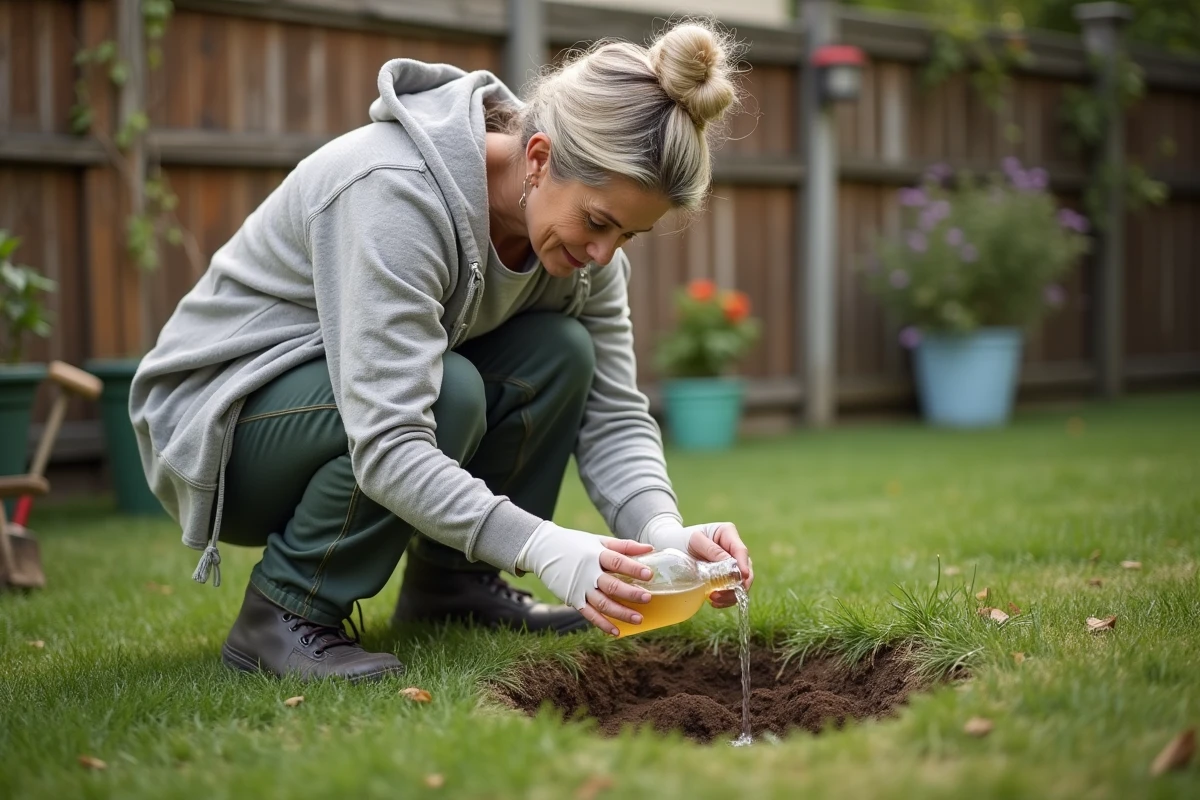 L’option la plus courante, c’est l’eau bouillante. Le principe : verser, tôt le matin ou en soirée, plusieurs litres d’eau frémissante directement dans l’entrée du nid. Cette méthode exige d’être rapide et bien protégé, vêtements longs, gants épais, protection du visage, mais elle ne laisse aucune trace toxique dans la terre, ce qui la rend intéressante pour les espaces fréquentés par les enfants ou les animaux.