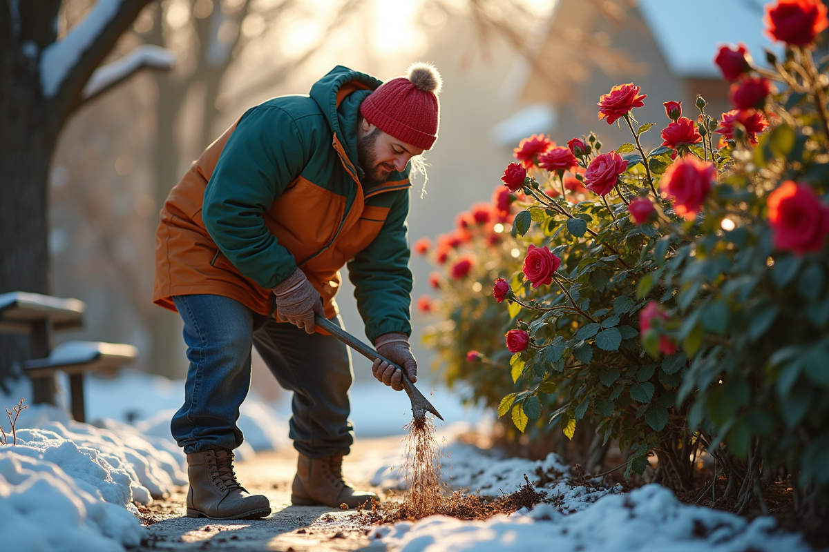 Pour renforcer la protection contre le gel, appliquez un paillis organique autour de la base du rosier. Le paillis aide à maintenir une température stable du sol et réduit les fluctuations thermiques. Les matériaux comme la paille, les feuilles mortes ou le compost bien décomposé sont idéaux.