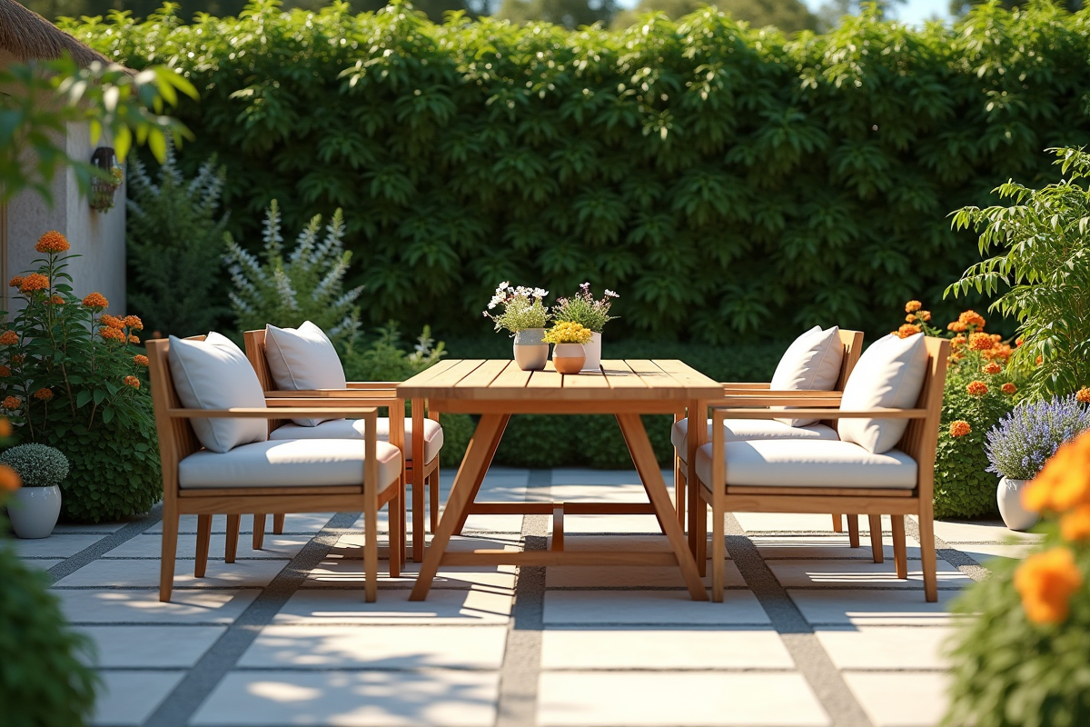 - Bois : noble et chaleureux, il nécessite un traitement régulier pour résister aux intempéries. Préférez les essences comme le teck ou l’acacia pour leur robustesse.