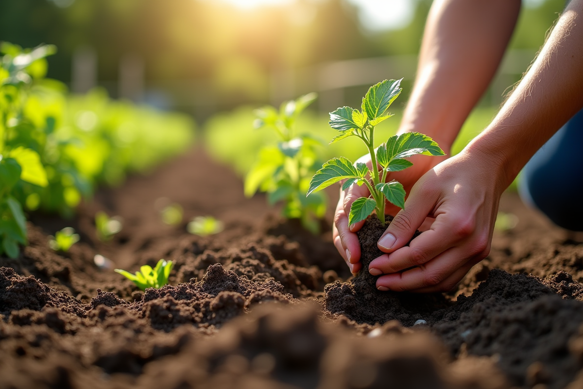 Le trou de plantation joue un rôle fondamental dans le développement des tomates. Creusez un trou d’environ 30 cm de profondeur et de largeur. Cette profondeur permet aux racines de s’étendre et de puiser les nutriments nécessaires. Remplissez le fond du trou avec une couche de compost bien décomposé. Évitez d’y mettre des feuilles d’orties fraîches, car elles peuvent brûler les racines.